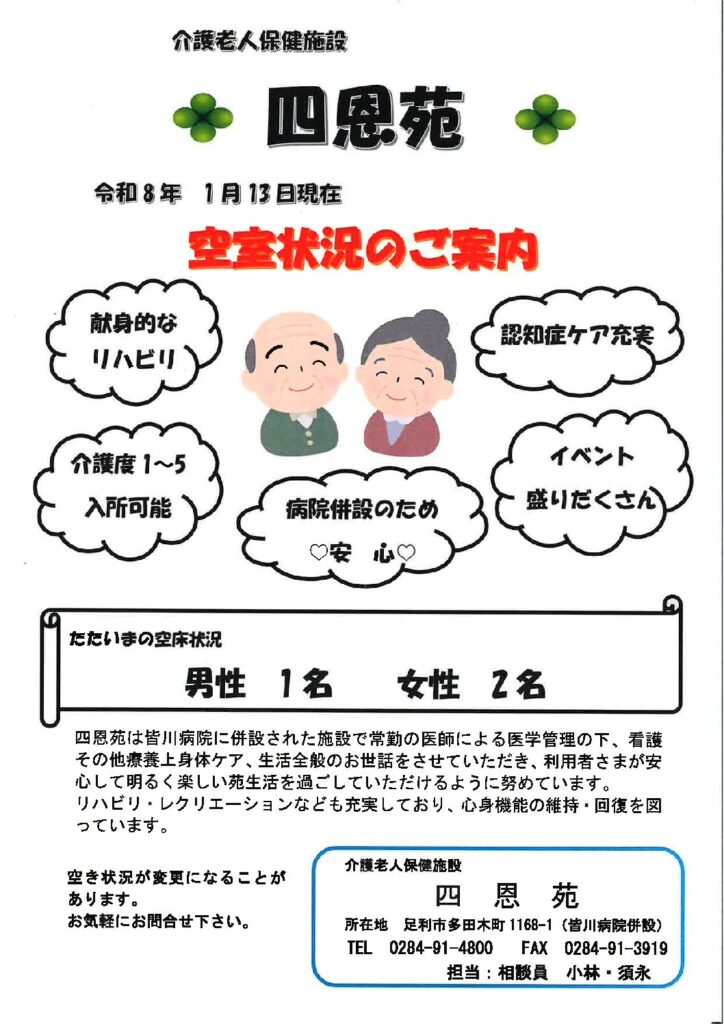 ≪介護老人保健施設四恩苑≫空床のお知らせ