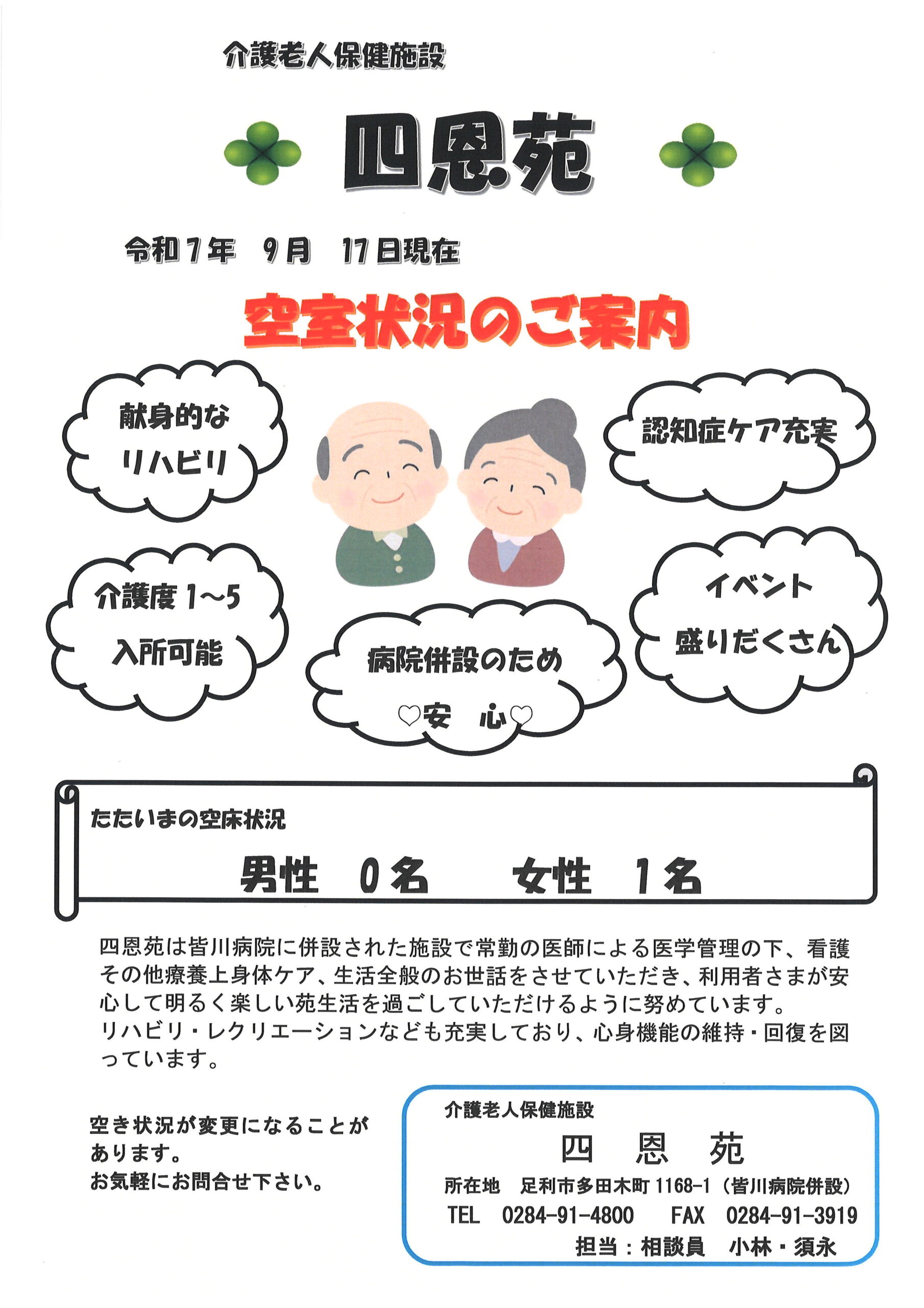 ≪介護老人保健施設四恩苑≫空床のお知らせ